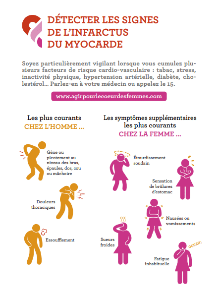 ATTENTION : Pour les femmes, les personnes âgées ou personnes diabétiques, il peut survenir sans douleur. Il peut alors se manifester par un malaise, un essoufflement soudain, une fatigue intense et soudaine, pâleur, nausées, vomissements.